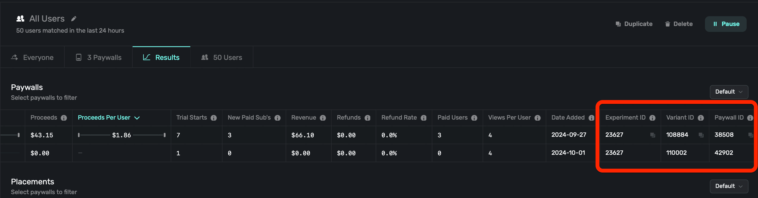 To view the results of any paywall experiment that's running, click the Results tab in the campaign details view: