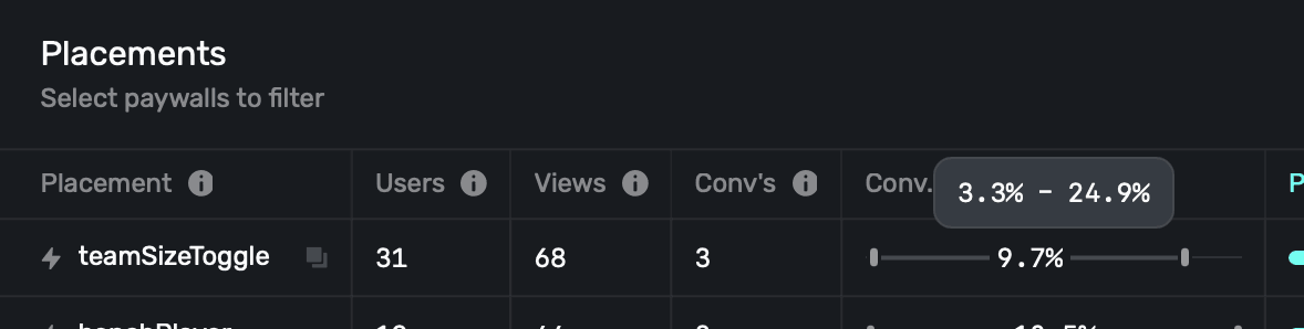 Use confidence intervals to gauge how each paywall is performing against the other ones in your experiments. Hover over a specific metric to view the confience interval (i.e. Conversion Rate, Proceeds Per User, etc.):