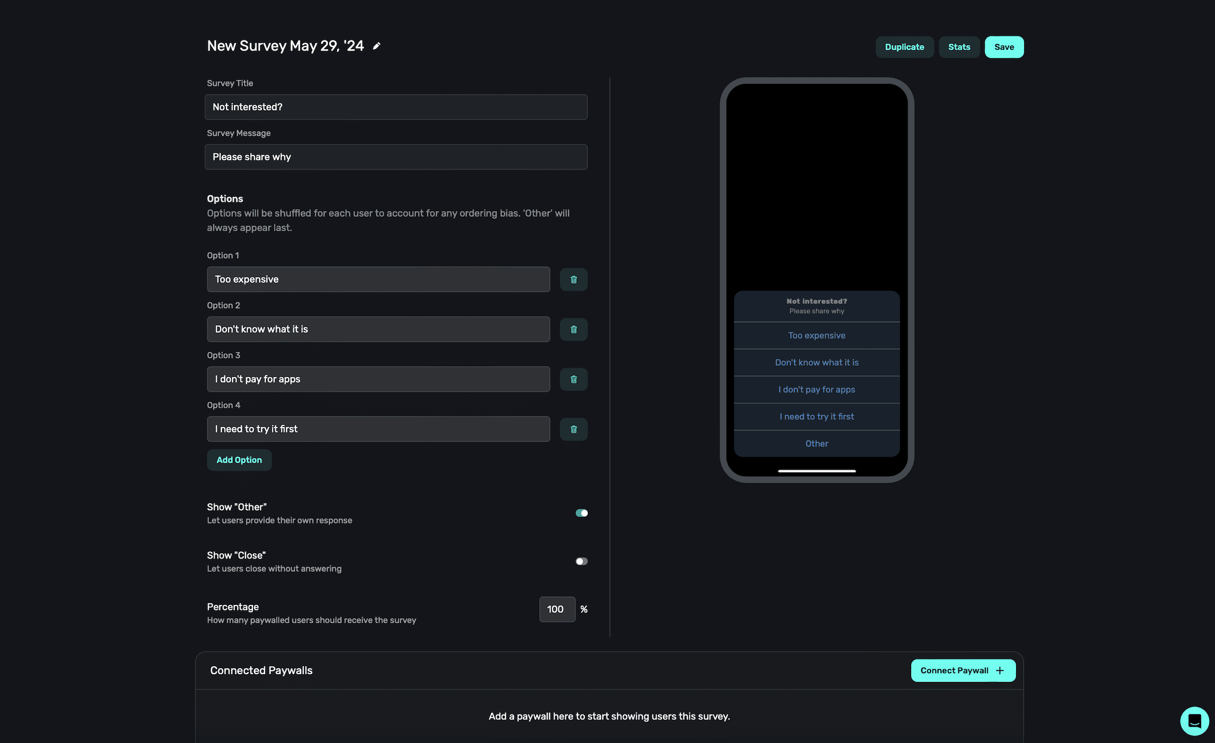 After you've selected a paywall, click the Connect button and you're all set. From there, each user will only see the survey once per paywall.
