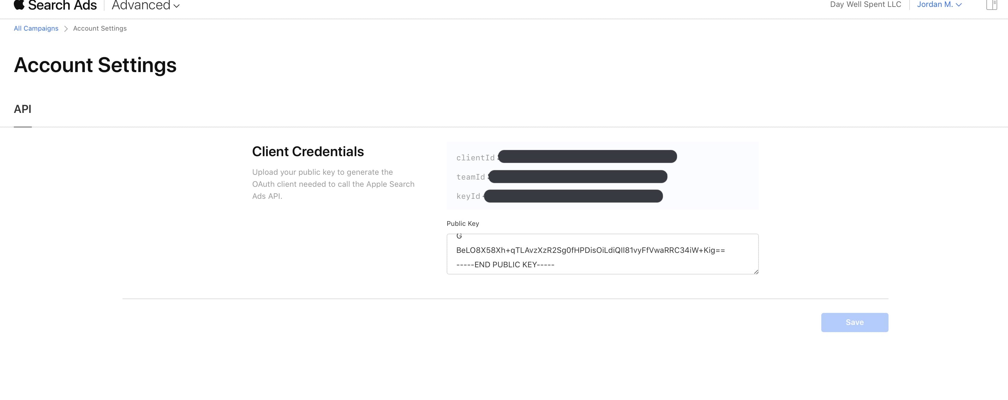 - Back in Apple Search Ads, paste the public key under Public Key and click Generate API Client: