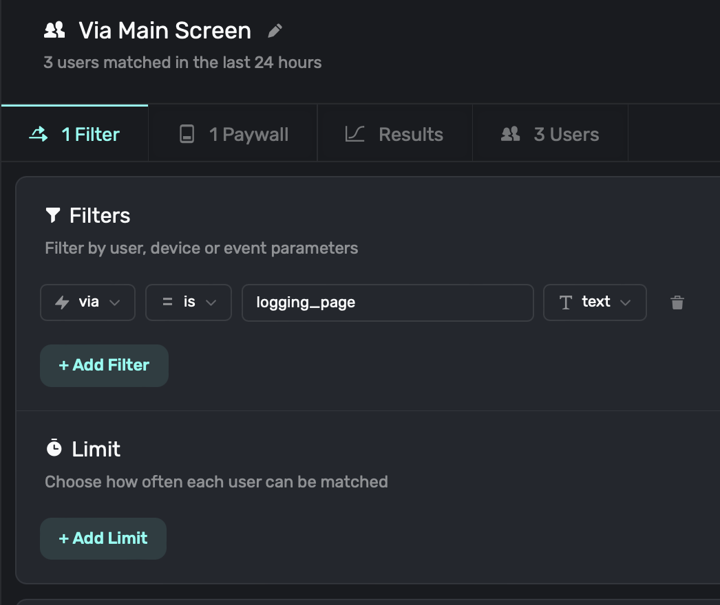 });The via parameter could now be used all throughout Superwall. You could create a new audience which has filters for each place users logged caffeine from, and unique paywalls for each of them.